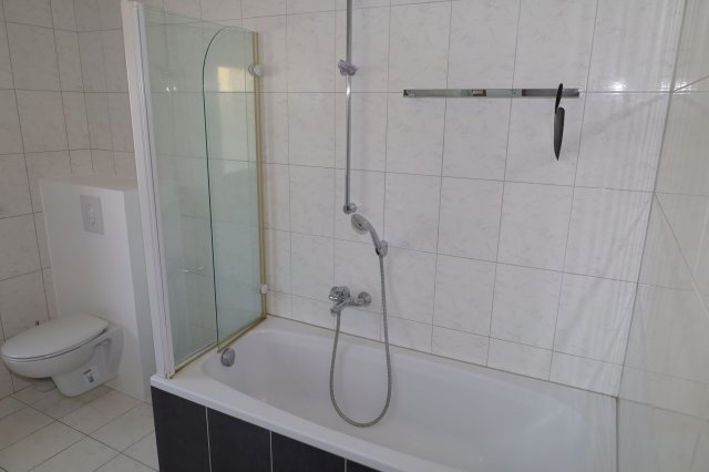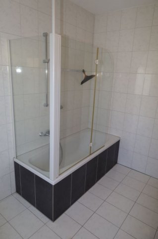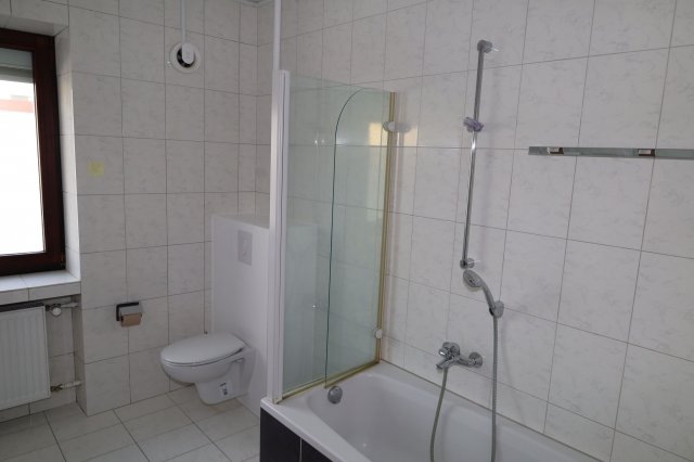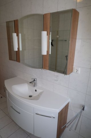 Das Bad ist mit Waschbecken, Wandschrank mit Spiegel, Wanne mit Dusche und einem WC ausgestattet. Das Bad besitzt ein eigenes Fenster.