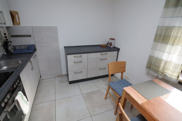 Weiterhin befindet sich in der Küche ein Herd mit Ceranfeld und Backröhre, eine Spülmaschine und ein Kühlschrank mit einem Gefrierfach.
