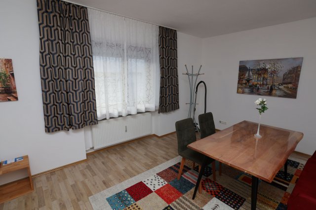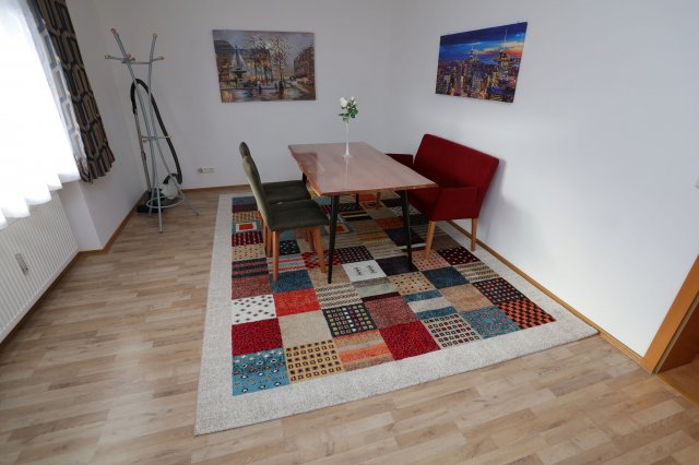 Das Wohnzimmer steht für die gesamte WG gemeinschaftlich zur Verfügung. Der Wohnbereich befindet sich räumlich neben der Küche und ist ausgestattet mit einem Tisch, einer Sitzbank, 2 Stühlen und einem Teppich.