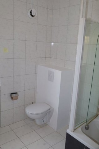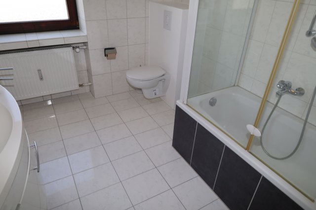 Das Bad ist mit Waschbecken, Wandschrank mit Spiegel, Wanne mit Dusche und einem WC ausgestattet. Das Bad besitzt ein eigenes Fenster.